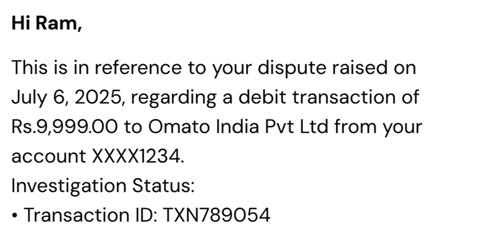 This is in reference to your dispute raised on July 6, 2025, regarding a debit transaction of Rs. 9,999.00 to Omato India Pvt Ltd from your account XXXX1234. Investigation Status: •Transaction ID: TXN789054